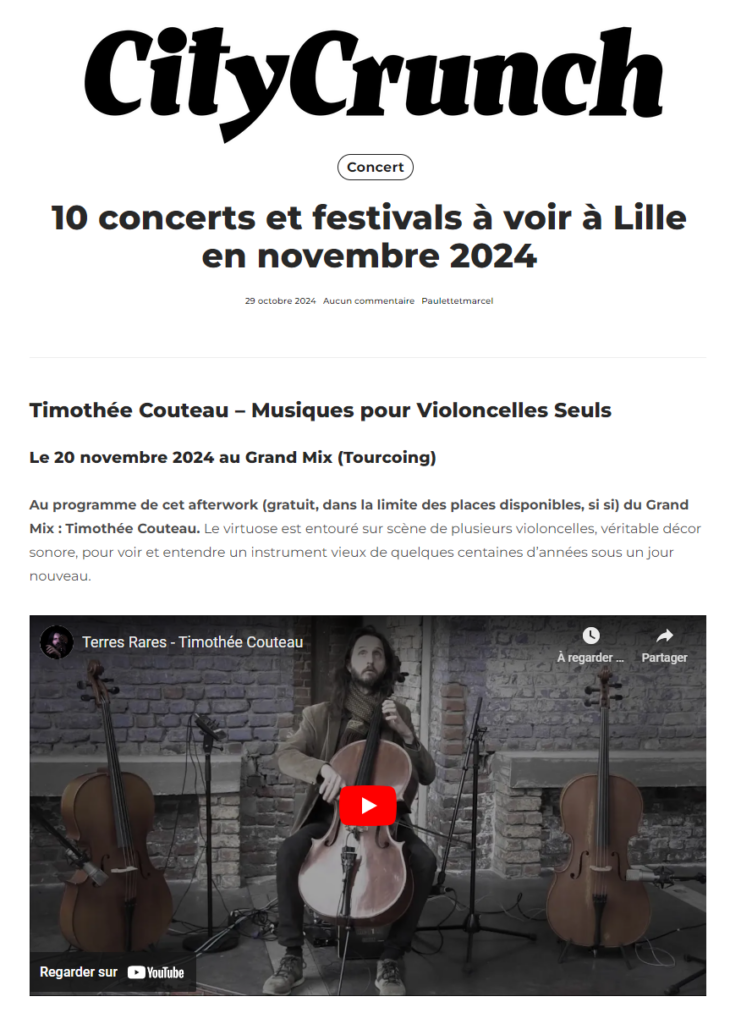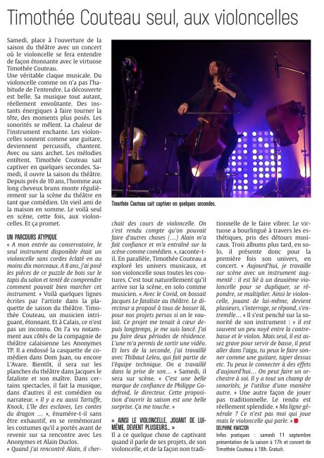 «[…] Une véritable claque musicale. Du violoncelle comme on n’a pas l’habitude de l’entendre. La découverte est belle » Sa musique tout autant, réellement envoûtante. Des instants énergiques à faire tourner la tête, des moments plus posés. Les sonorités se mêlent. La chaleur de l’instrument enchante. les violoncelles sonnent comme une guitare, deviennent percussifs, chantent. Avec ou sans archet. Les mélodies entêtent. Timothée Couteau sait captiver en quelques secondes.[…]