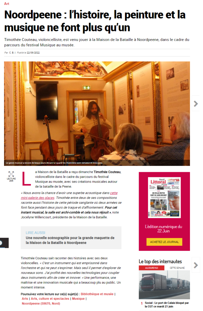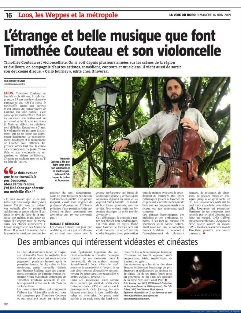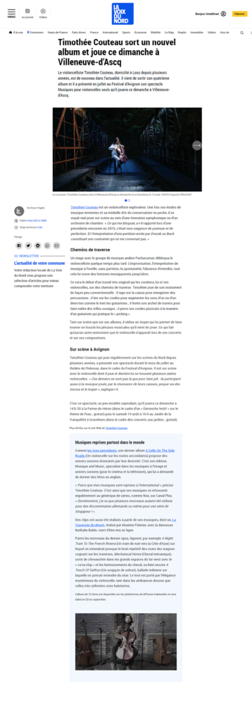 Le samedi 3 septembre à 16h40, sur France Bleu Nord, Timothée Couteau était l’invité d’Agnès Delbarre pour ‘France Bleu Musique’. Il y a parlé de son premier disque en solo ‘Les Violoncelles Seuls’