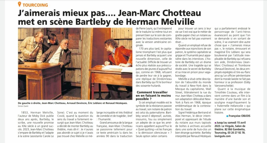 Dès sa première lecture du court roman d’Herman Melville, et avant même qu’il en décidât d’en faire une adaptation pour le théâtre et cinq personnages, Jean-Marc Chotteau fut séduit par la note profondément mélancolique, ponctuée de quelques intermèdes frôlant la farce ou le burlesque, qui se dégageait du roman.